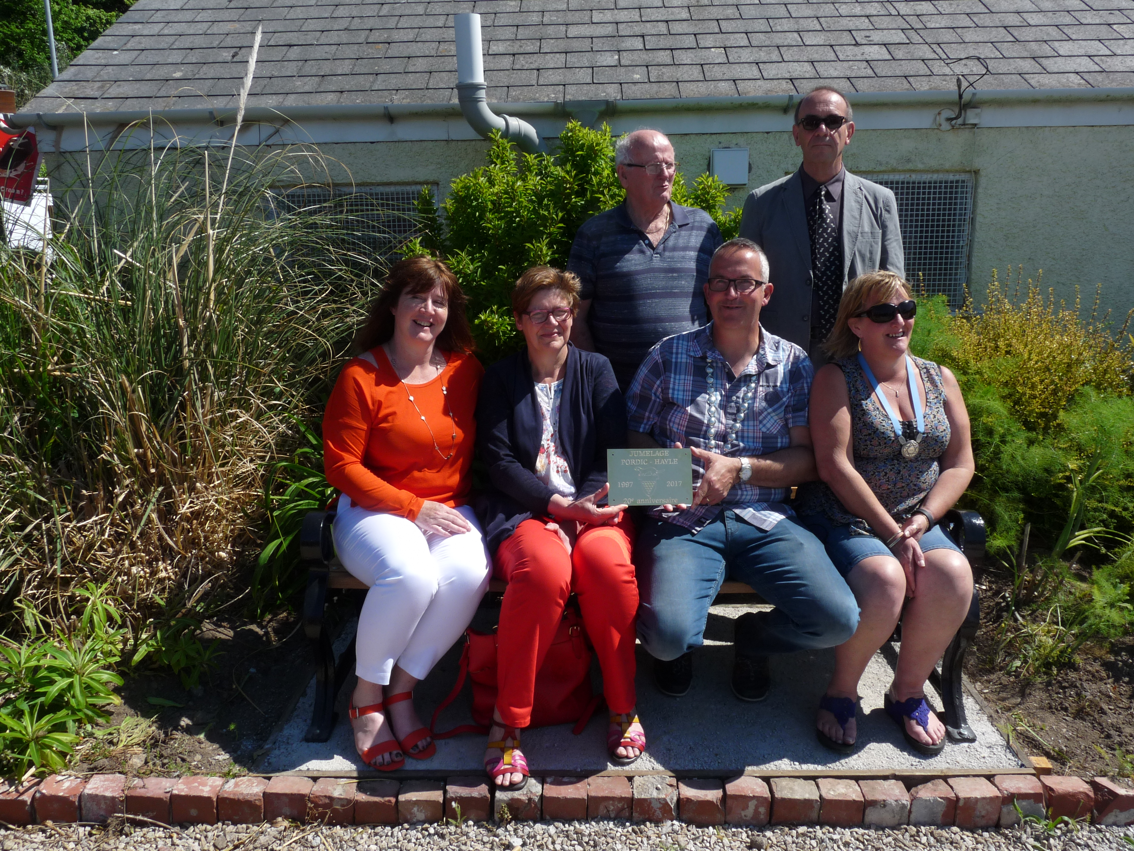 Samedi 26 août 2017 : célébration du 20 ème anniversaire du jumelage à la Mairie de Pordic, en compagnie de la délégation anglaise (les Présidentes des 2 Comités de Jumelage, assises sur le banc offert lors du 20 ème anniversaire avec à l'arrière plan, les anciens Présidents).
