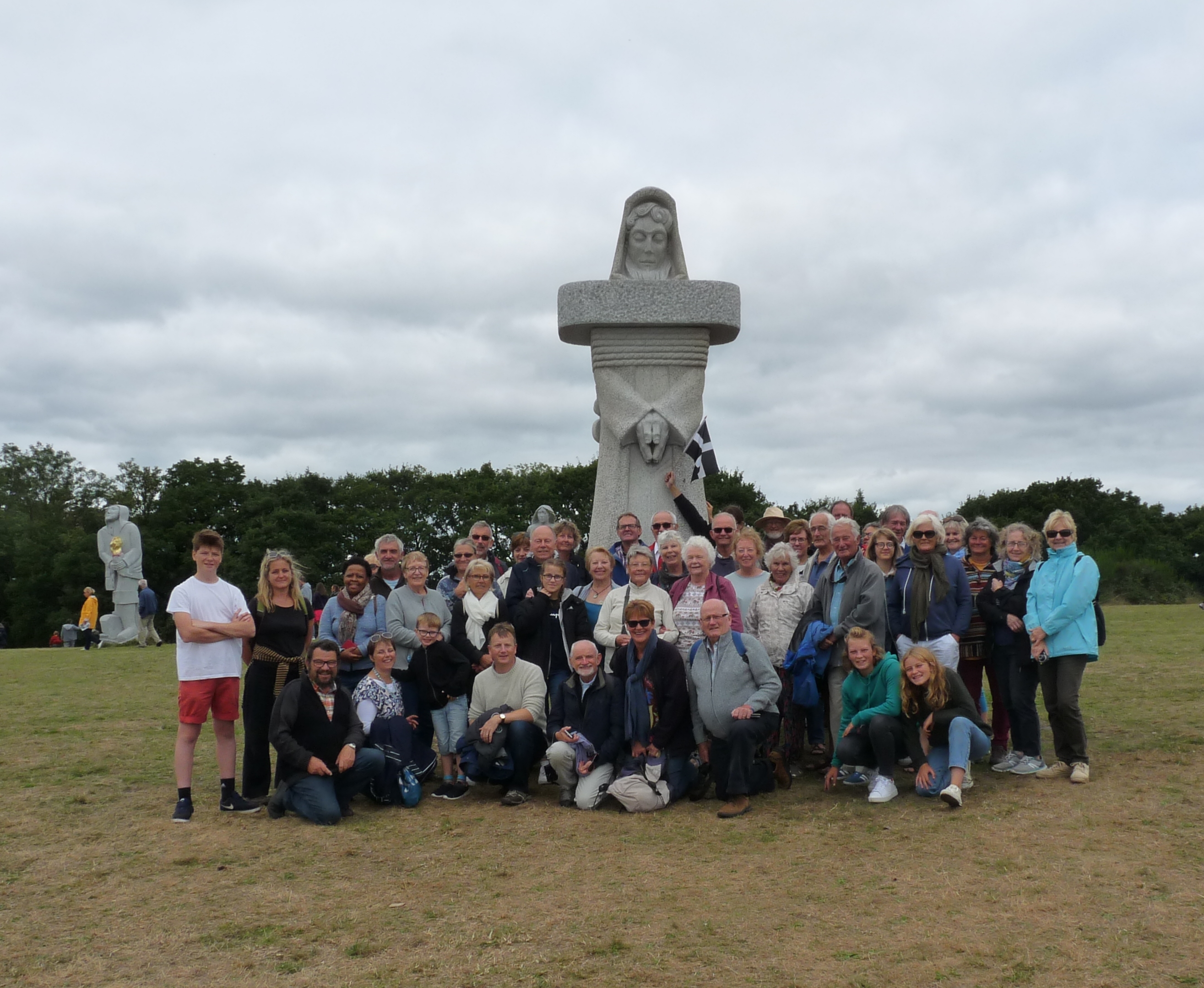 Le groupe de Cornouaillais et de Pordicais devant la statue de Saint-Piran à la Vallée des Saints à Carnoët le lundi 27 août : l'aboutissement du projet 2018.