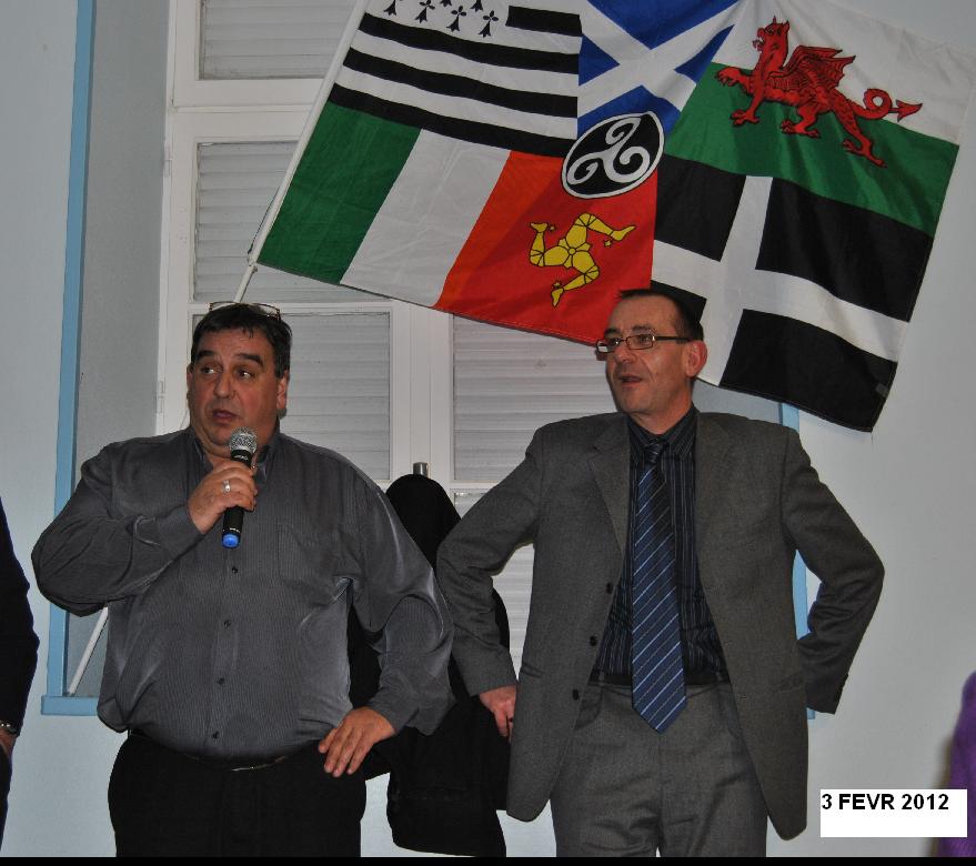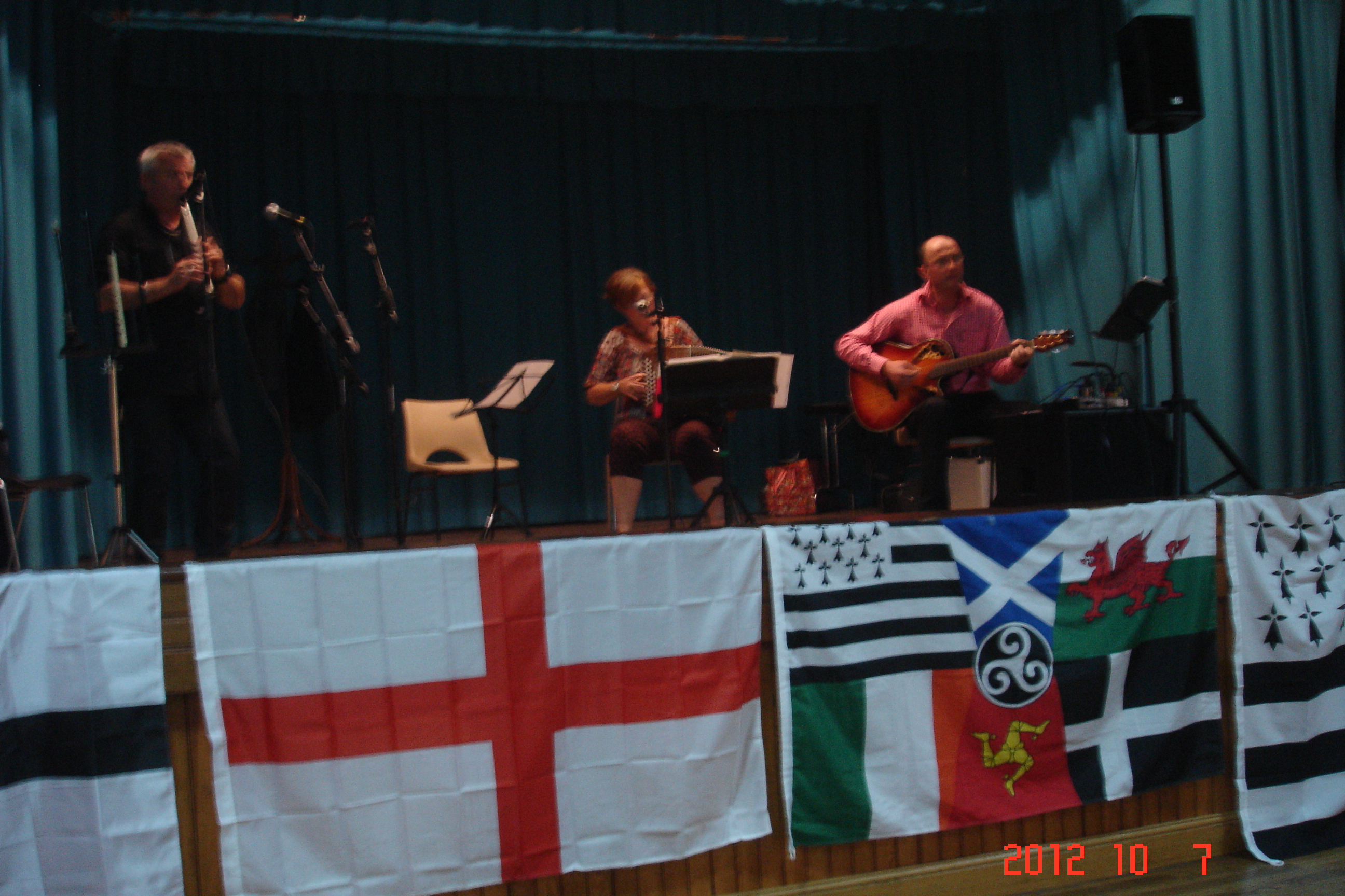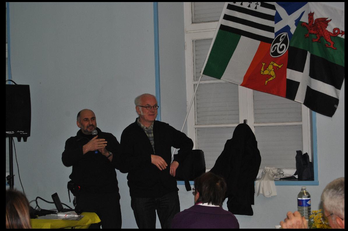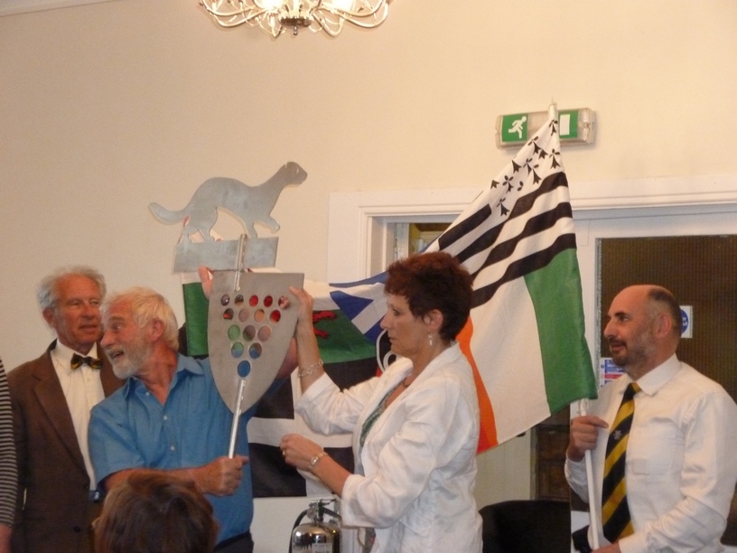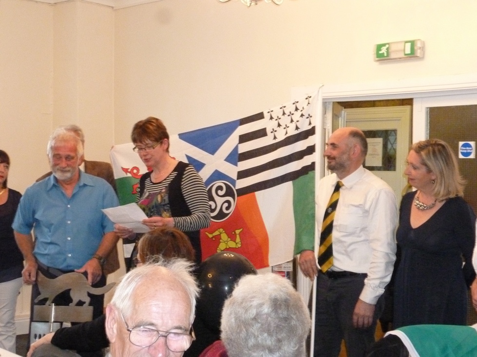 Jeudi 17 mai 2012 20H10 : Discours de Mme Marie Frédérique BLOT LE-POTIER, maire-adjoint de Pordic à Mike STUCKEY président du Twinning Committee et sous le regard d'Anne-Marie MOUNIER vice présidente aux cotés de Jean-Paul LE DANTEC soutenant le drapeau interceltique !