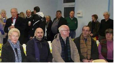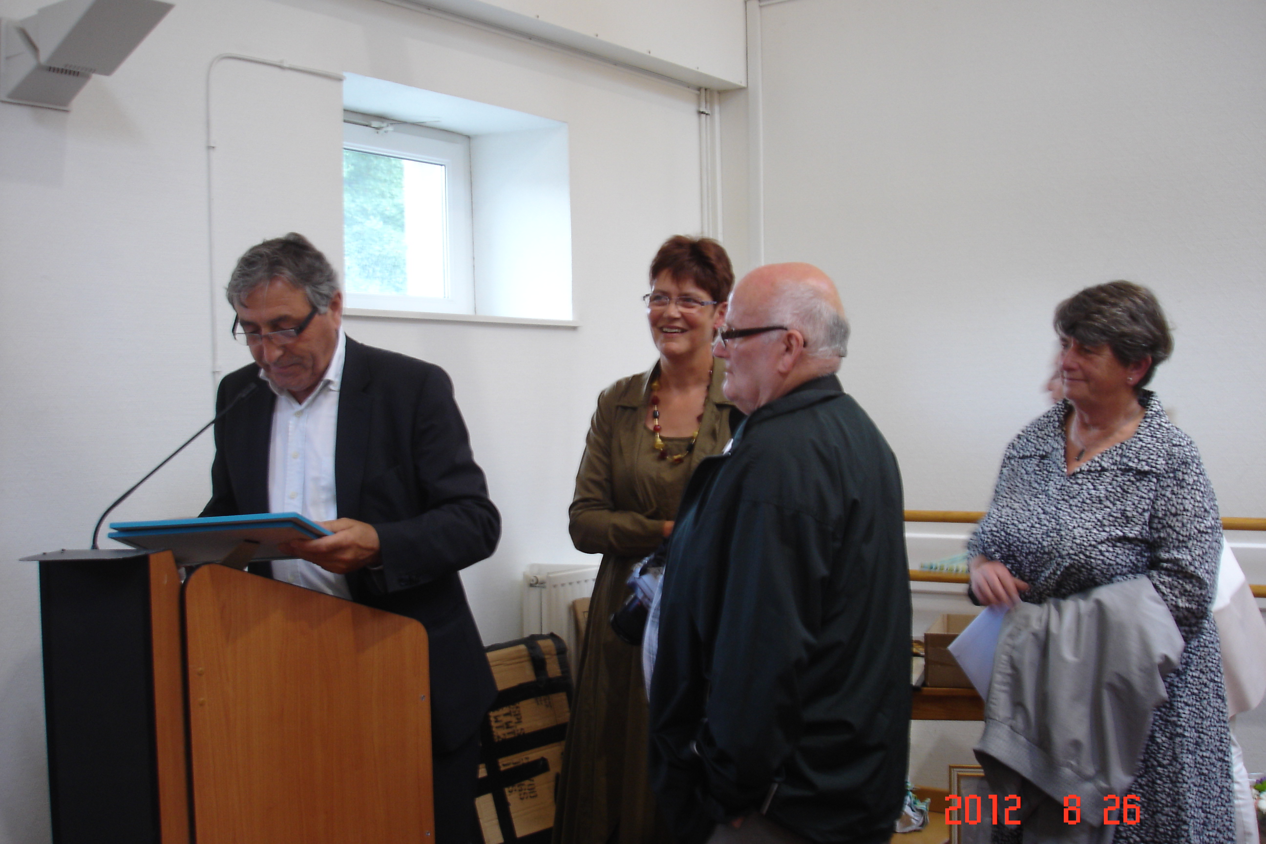 Claude LE POTIER premier président du jumelage, et Robert ROLANDO (au micro) nous ont fait revivre avec émotion les principales étapes de la création du jumelage en fin 1996 & début 1997.