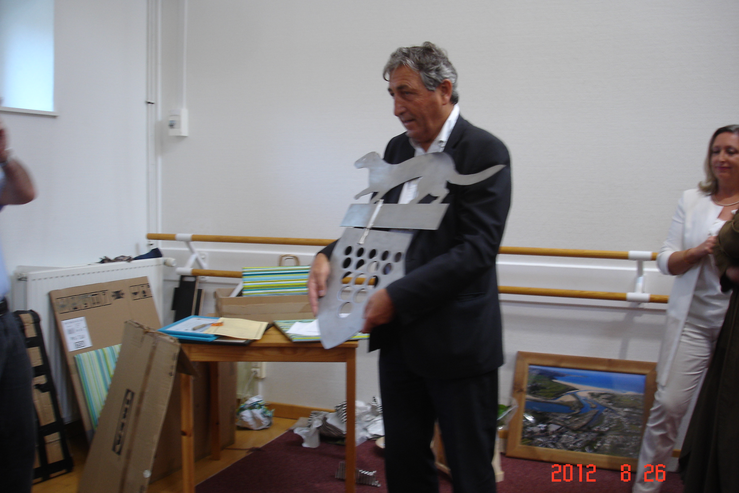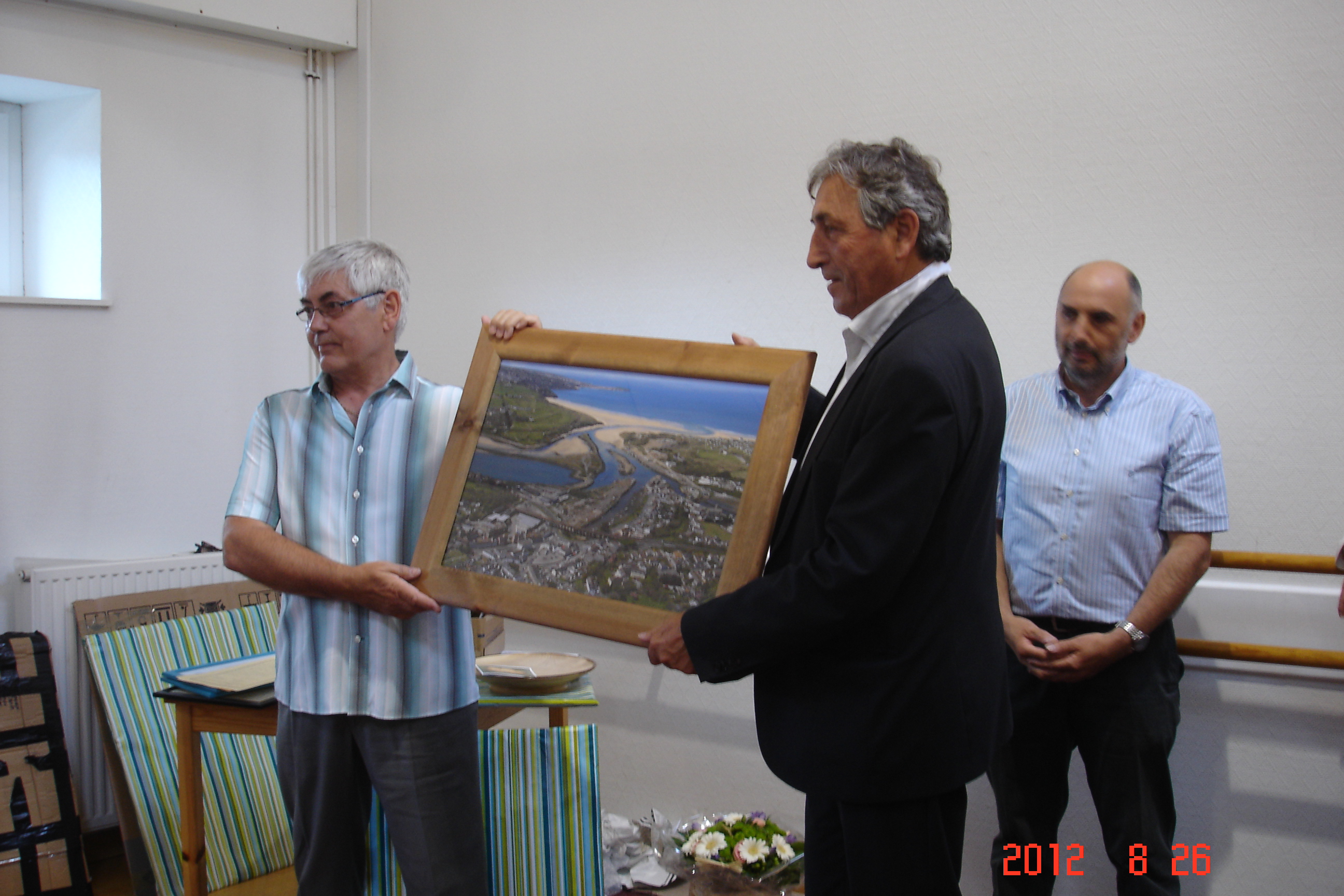 Lors de cette soirée du 17 mai 2012, une magnifique représentation de la girouette sur plaque acier dessinée et peinte par le peintre pordicais Cartahu et adhérent du jumelage, a été offerte par le comité de jumelage de PORDIC & Hayle au Twinning Commitee pour commémorer ces 15 années de relations cordiales et ininterrompues !