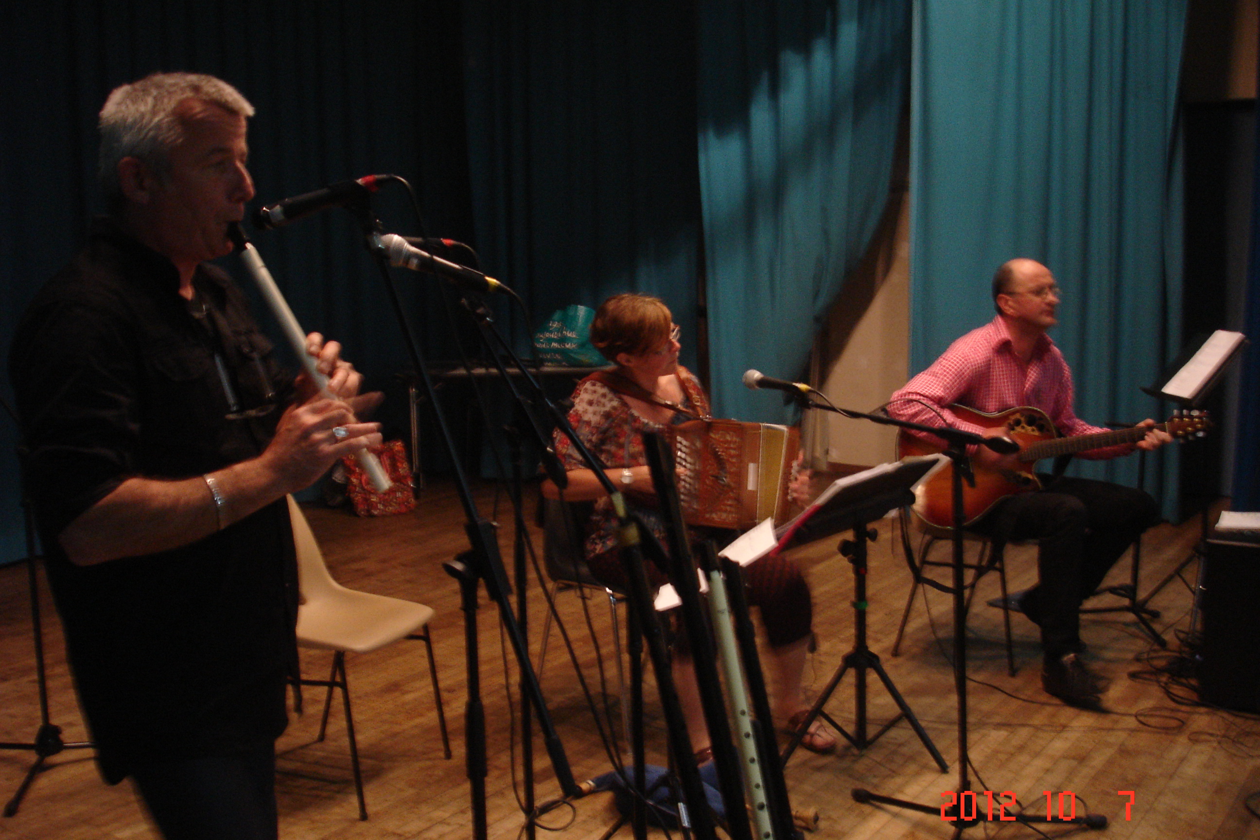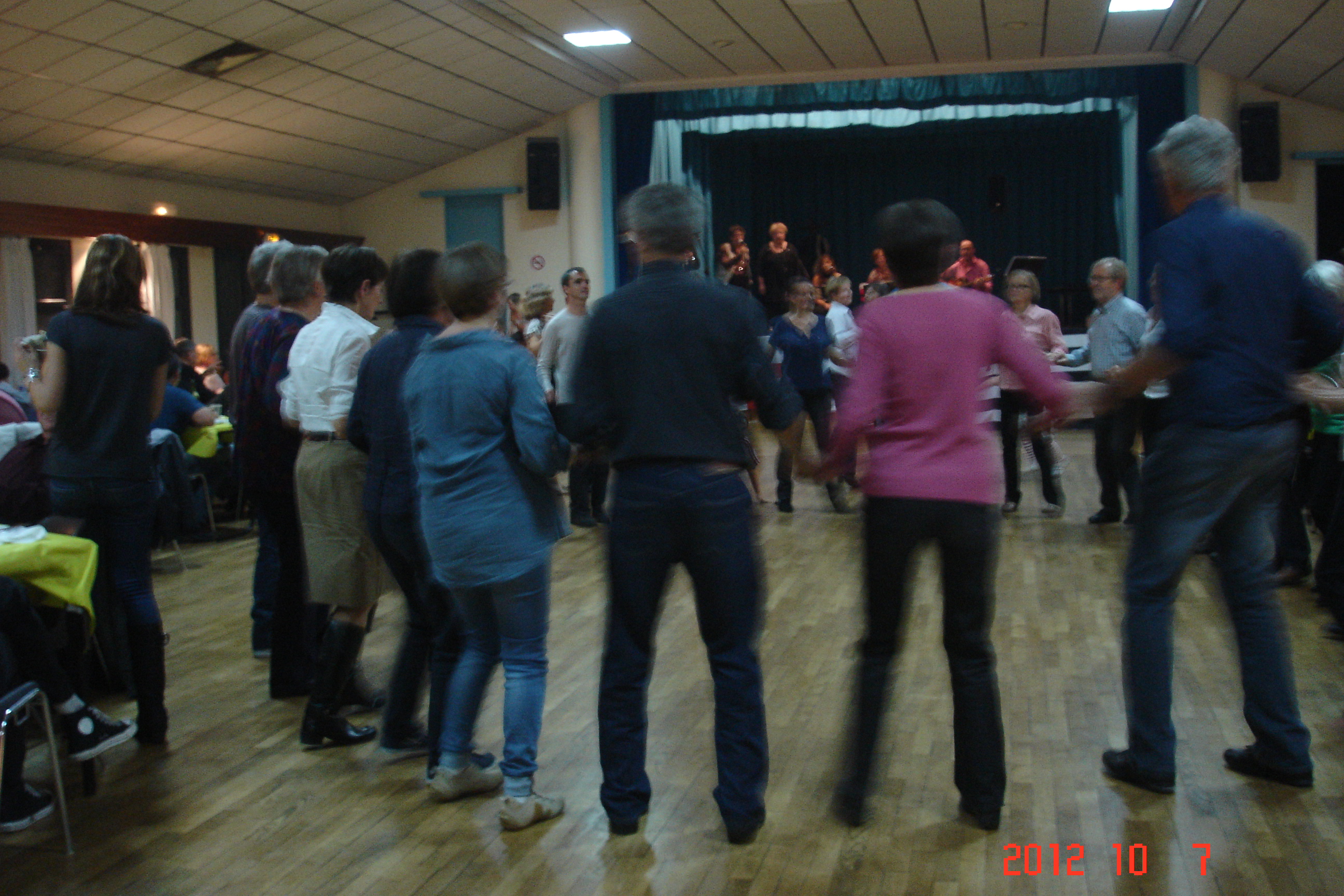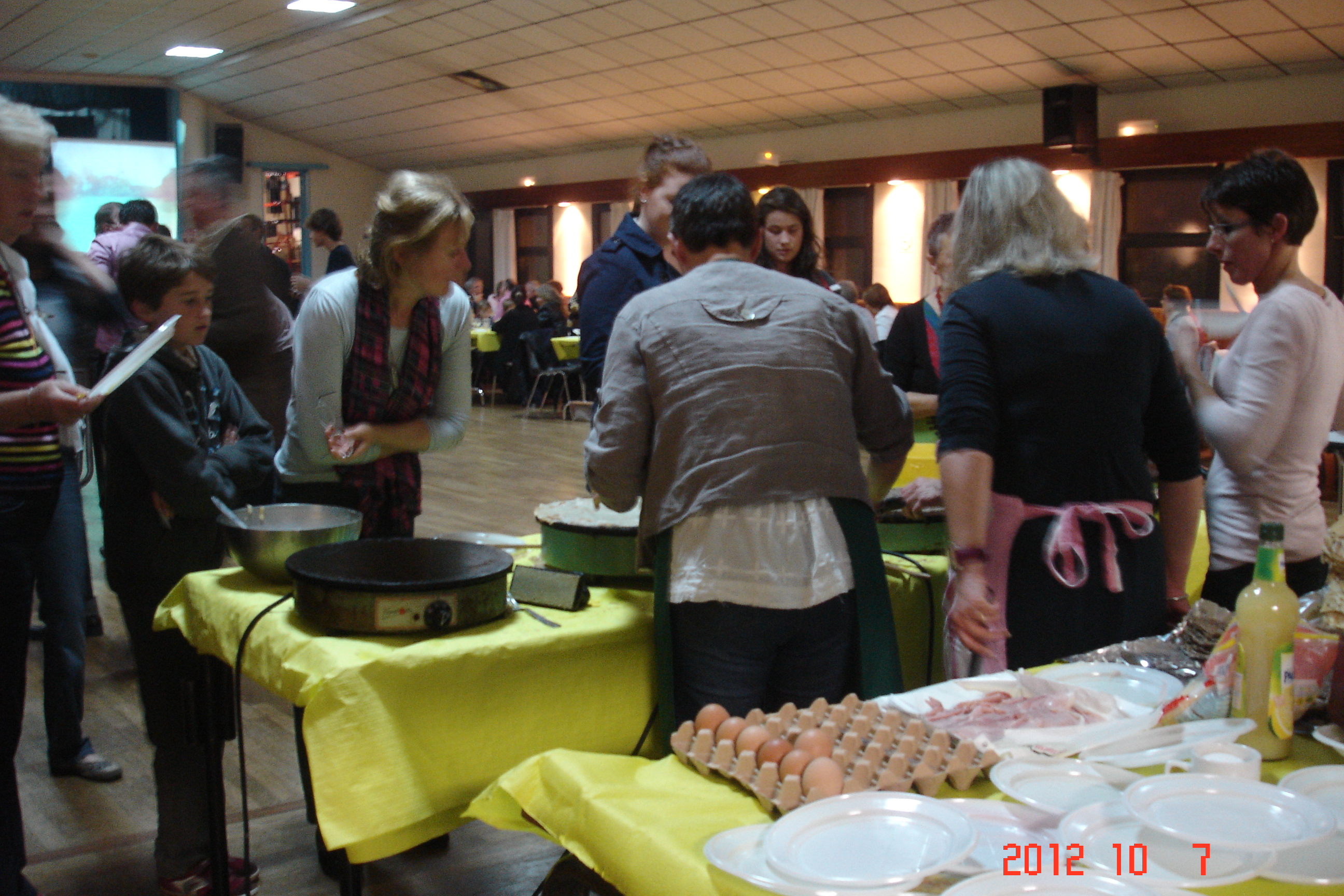 Cette soirée qui a permis de clôturer l' année du 15ème anniversaire dans une ambliance très conviviale à la salle des fêtes, a connu un vif succès (150 entrées environ). Elle a débuté par une soirée crèpes et galettes (photo) et s'est poursuivie par un mini fest-noz animé avec dynamisme et enthousiasme par le groupe "GALETTE O' ROM !" (photos ci-dessous). La soirée a aussi permis de projeter film et diaporamas sur les voyages 2012 des pordicais à Hayle et de nos amis anglais à Pordic.