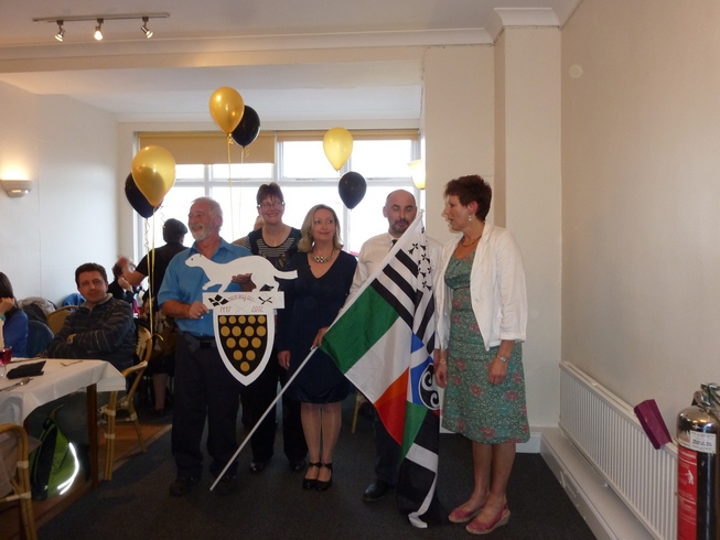 Le jeudi 17 mai 2012, vers 19H40 une girouette combinant l'hermine (symbole de la Bretagne) et le blason de Cornwall a été offerte lors du repas au Lugger Hotel de Penzance (Cornwall) aux habitants de Hayle en l'honneur du 15eme anniversaire de notre jumelage. Cette girouette en acier inoxydable (merci à Jean-Luc FINANCE pour la qualité de cette réalisation) est soutenue par Mike STUCKEY président et Tina ELLIOTT vice-présidente du comité de jumelage de Hayle ! En arrière plan, Jean-Pol DUMONT-LE DOUAREC historien binicais et membre du jumelage aide Jean-Paul LE DANTEC président du jumelage à soutenir le drapeau interceltique, symbole de l'unité des nations celtiques !