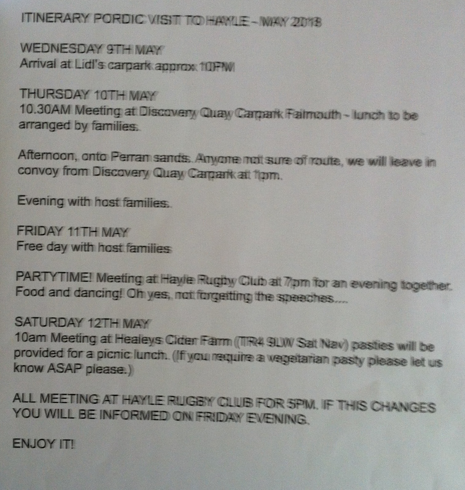 Le programme du séjour à Hayle (à la date du 25 avril 2018) :