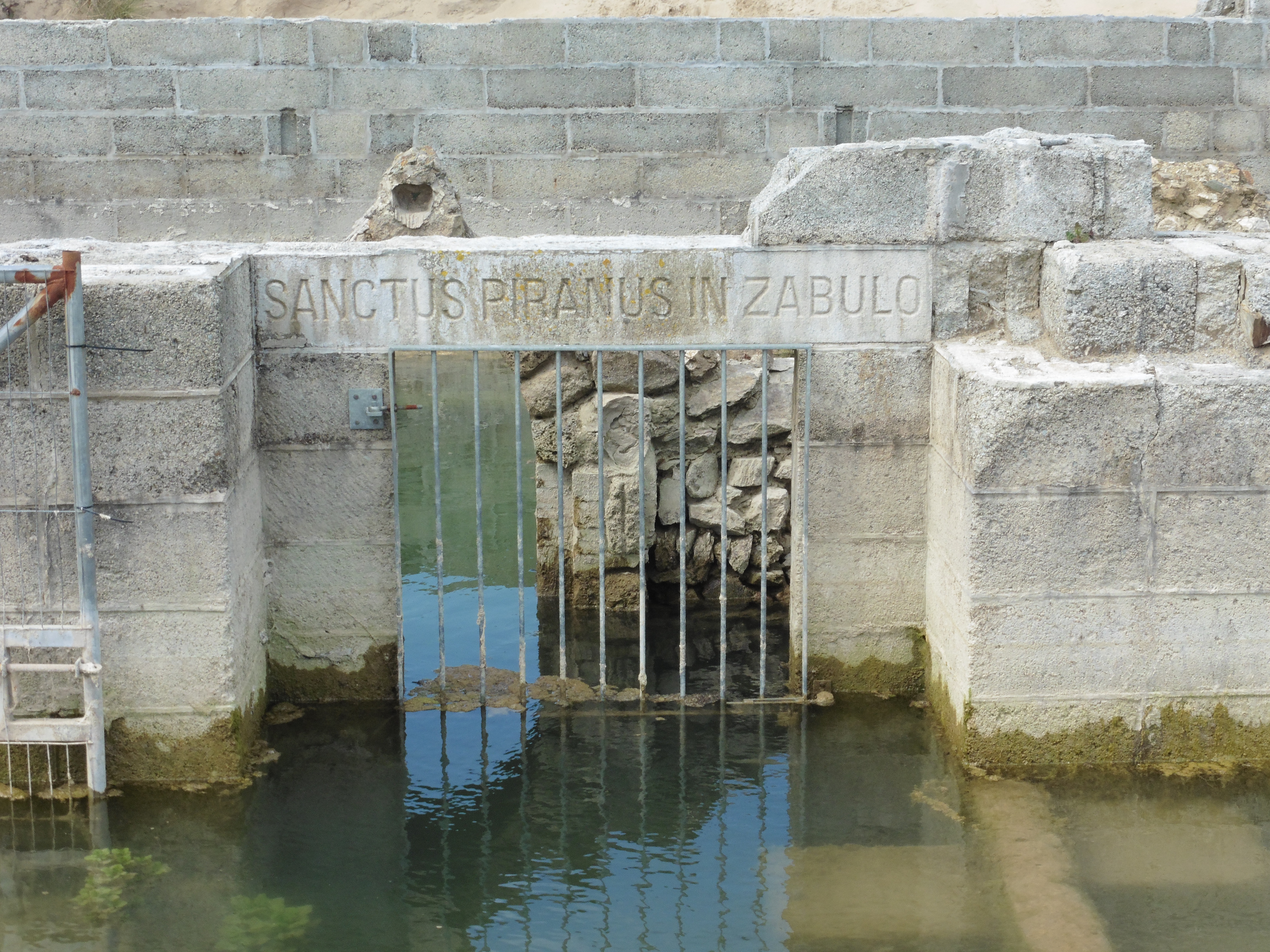 Saint-Piran, lesté d'une meule de pierre autour du cou (après plusieurs miracles, jeté à la mer par des rois pourfendeurs irlandais, il aurait dû couler ; mais la légende dit qu'il flotta jusqu'à cet endroit de la côte nord de Cornouailles appelé aujourd'hui Perranporth, pas très loin de Hayle).