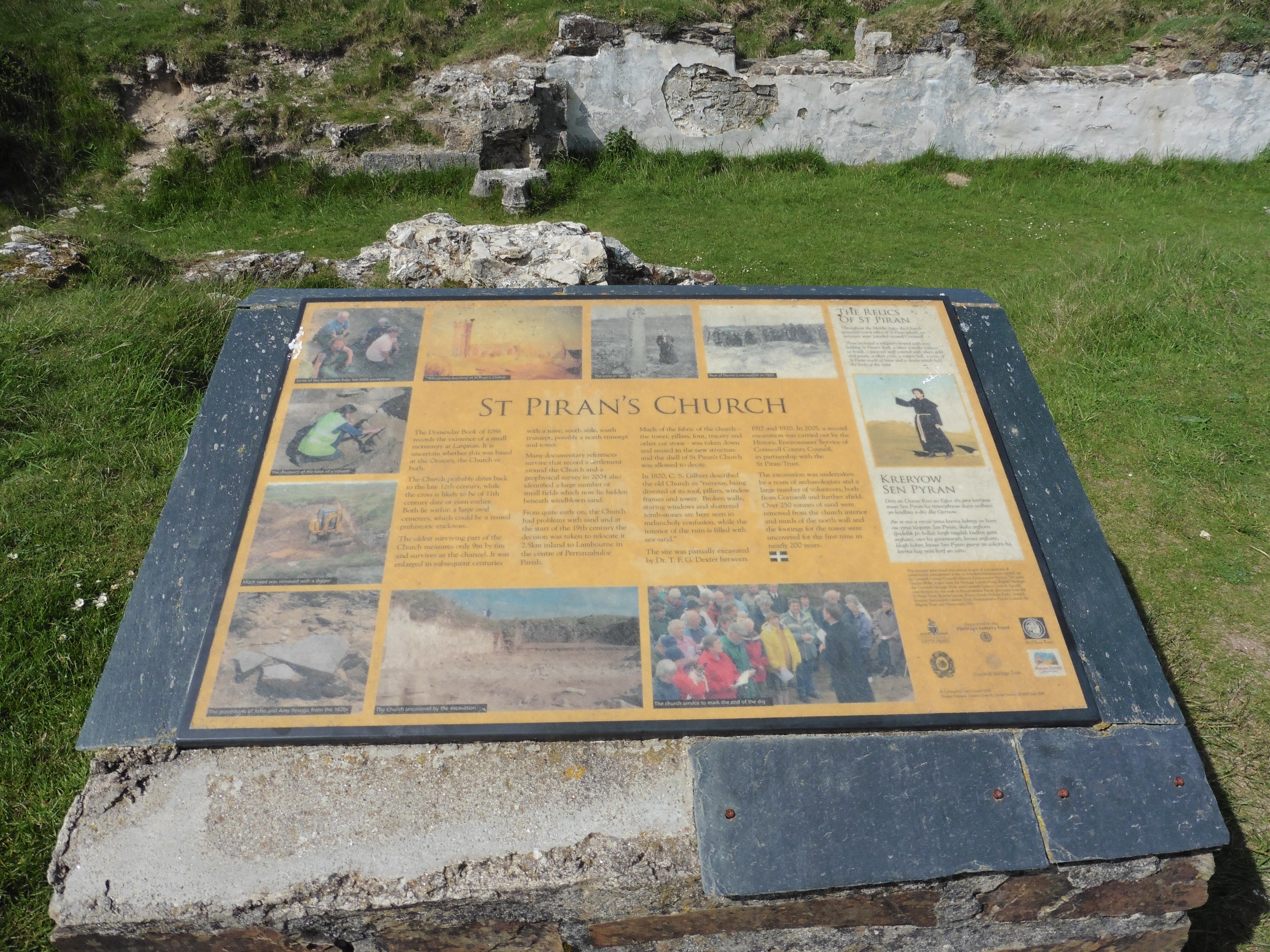La plaque à l'entrée des ruines de l'église de Saint-Pirran (12 ème siècle)
