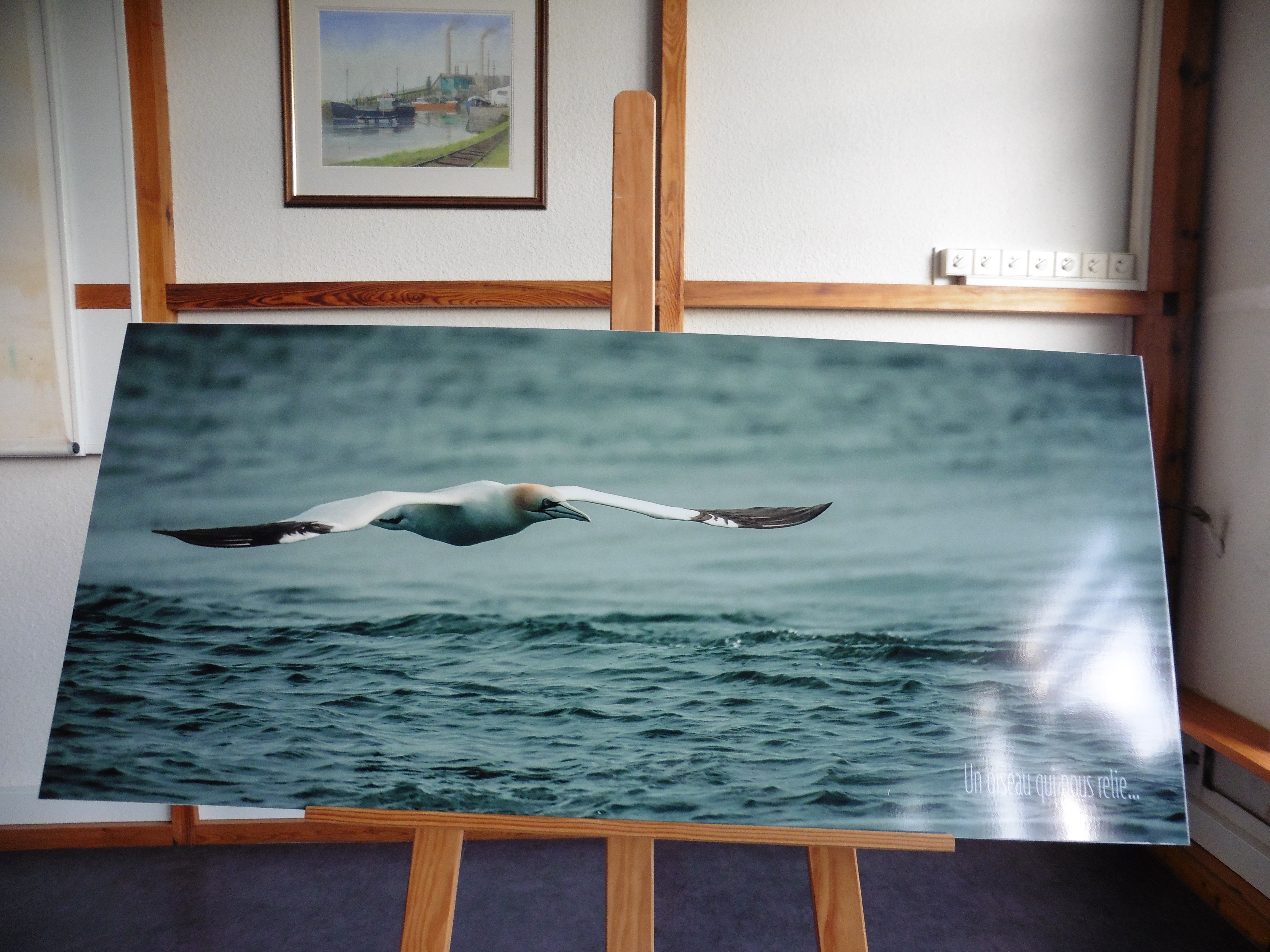 Cette photographie offerte par la Mairie de Pordic au Comité de Jumelage de Hayle, représente un fou de bassan en plein vol ; elle a été prise par un jeune pordicais, Marc Tisseau.