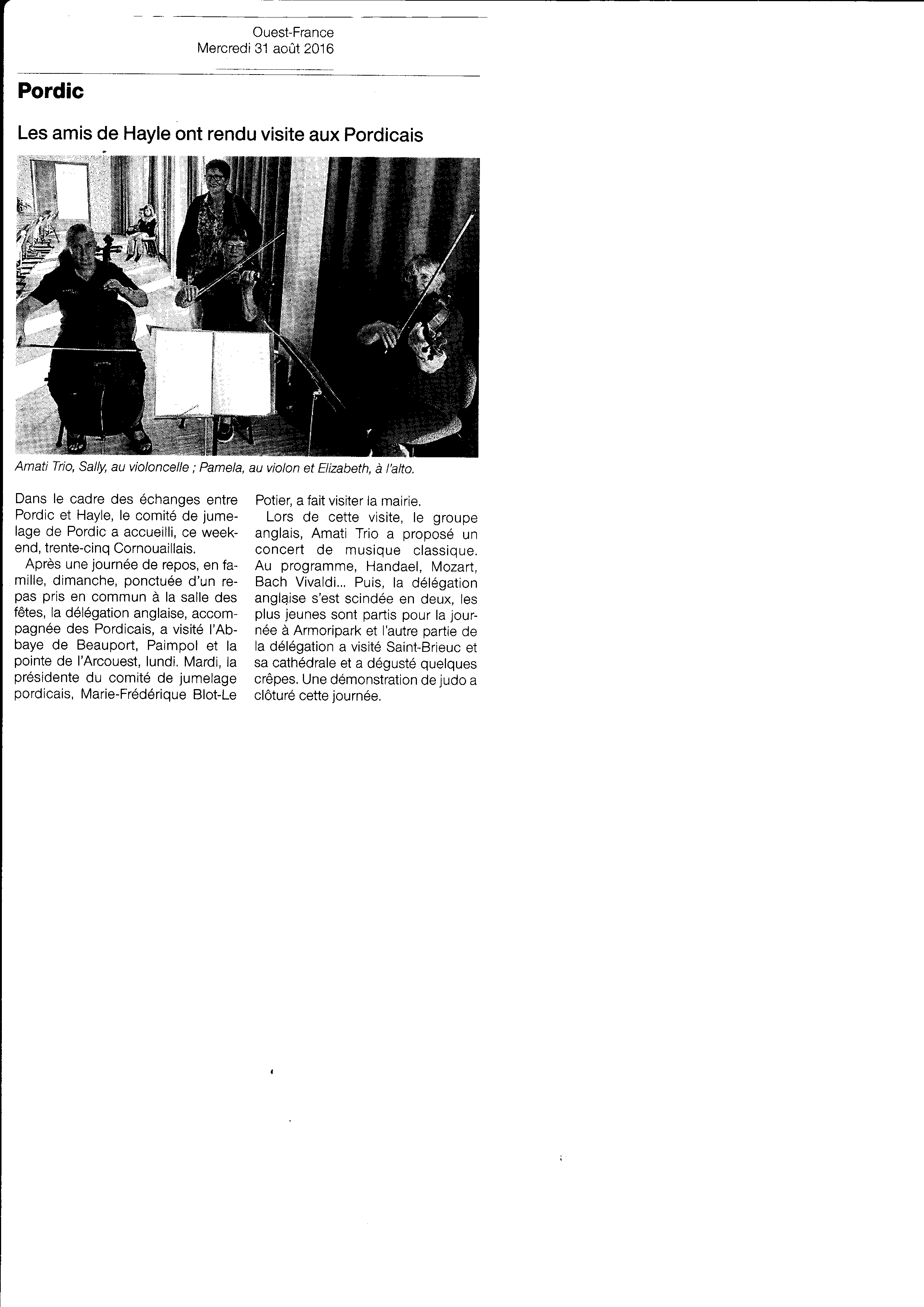Nos amis anglais ont séjourné à Pordic du samedi soir 27 août au mercredi matin 31 août 2016. Le programme élaboré par le bureau du Comité de Jumelage avait été présenté aux familles d'accueil lors d'une sympathique réunion le samedi 2 juilet.